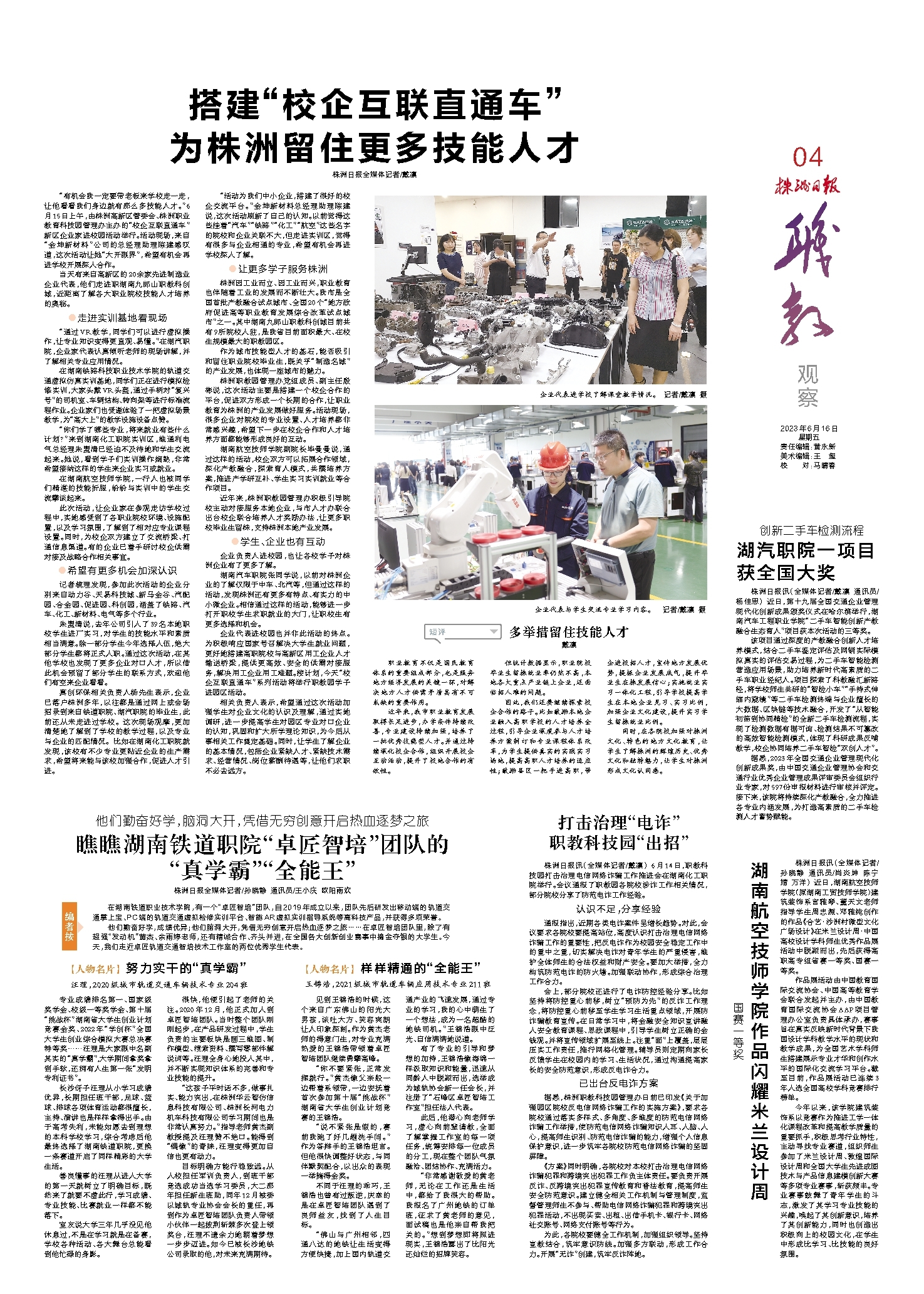 “有机会我一定要带老板来学校走一走,让他看看我们身边就有那么多技能人才。”6月15日上午,由株洲高新区管委会、株洲职业教育科技园管理办主办的“校企互联直通车”新区企业家进校园活动举行。活动现场,来自“金坤新材料”公司的总经理助理陈建感叹道,这次活动让她“大开眼界”,希望有机会再进学校开展深入合作。