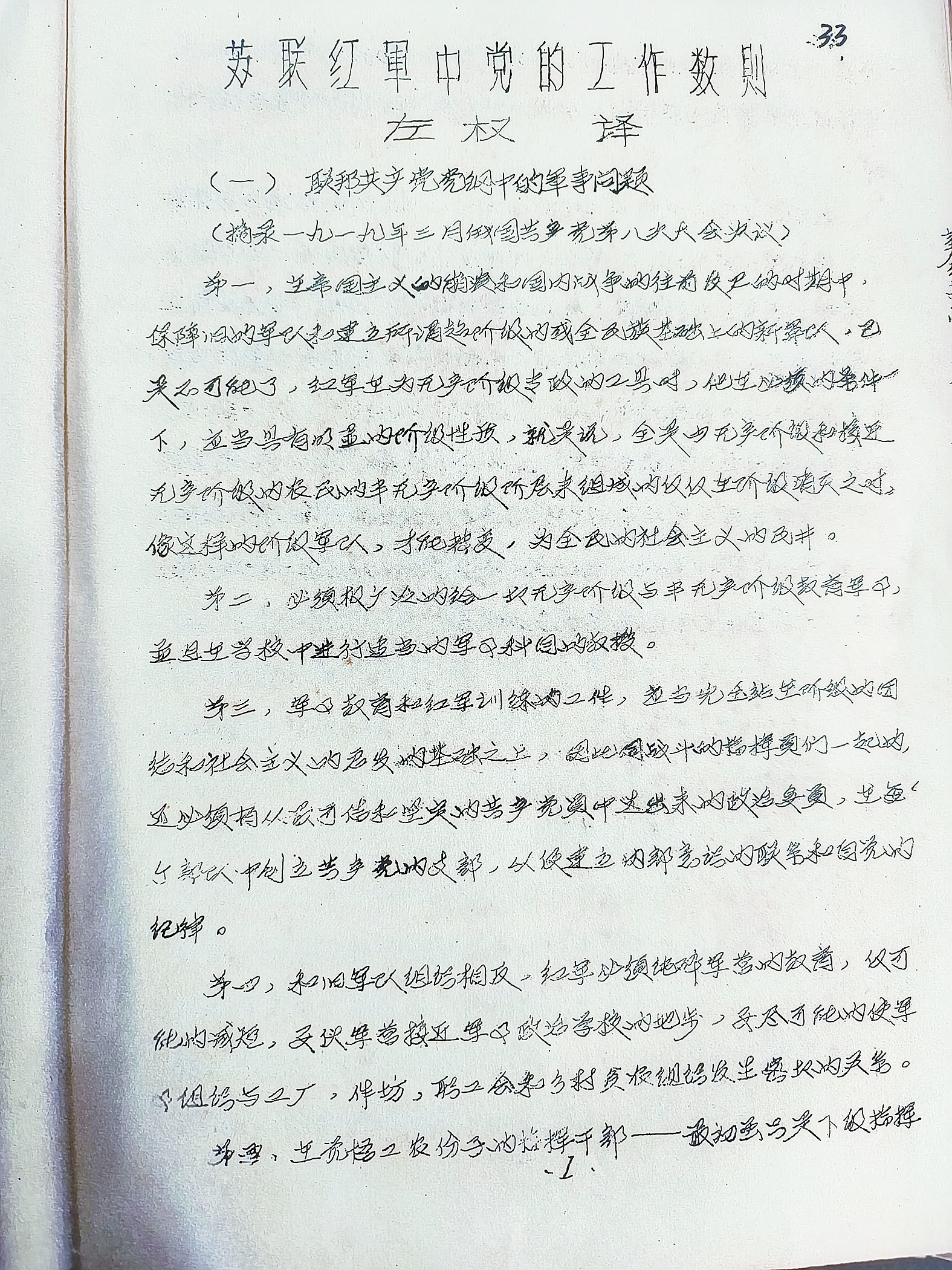 左权将军祖籍醴陵,是中国共产党抗战期间牺牲的最高级别将领。为建设株洲红色档案专馆,市档案馆专家组日前到江西征集红色档案,在瑞金发现了左权将军著作《军语解释》及译作《苏联红军中党的工作数则》,资料十分珍贵。