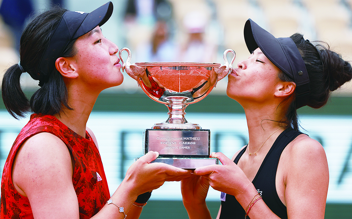 6月11日,王欣瑜(左)/谢淑薇亲吻女双冠军奖杯。 新华社记者 高静 摄