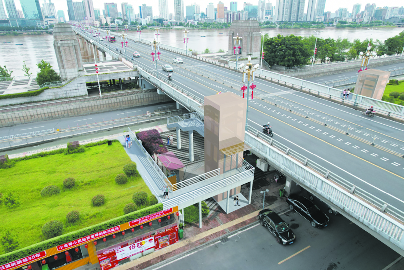 在设计方案中,将在滨江路西侧新建人行梯道+无障碍电梯。方便行人直接下桥。