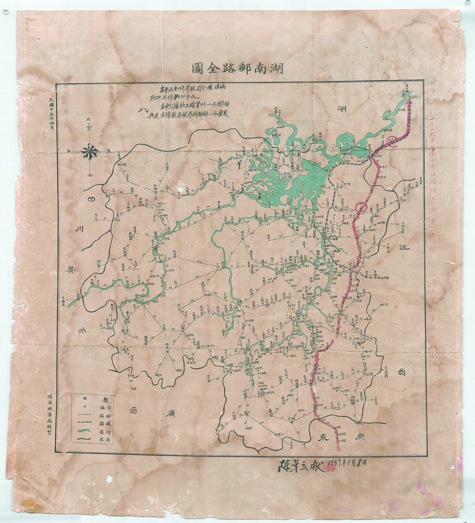 根据图上文字信息,《湖南邮路全图》为民国十五年(1926年)“陆军测量局”缩制,图上详尽地标注了湖南境内的县、市镇、邮路、铁路和河道等地理信息,用红笔清晰地标注了独立团行军路线。