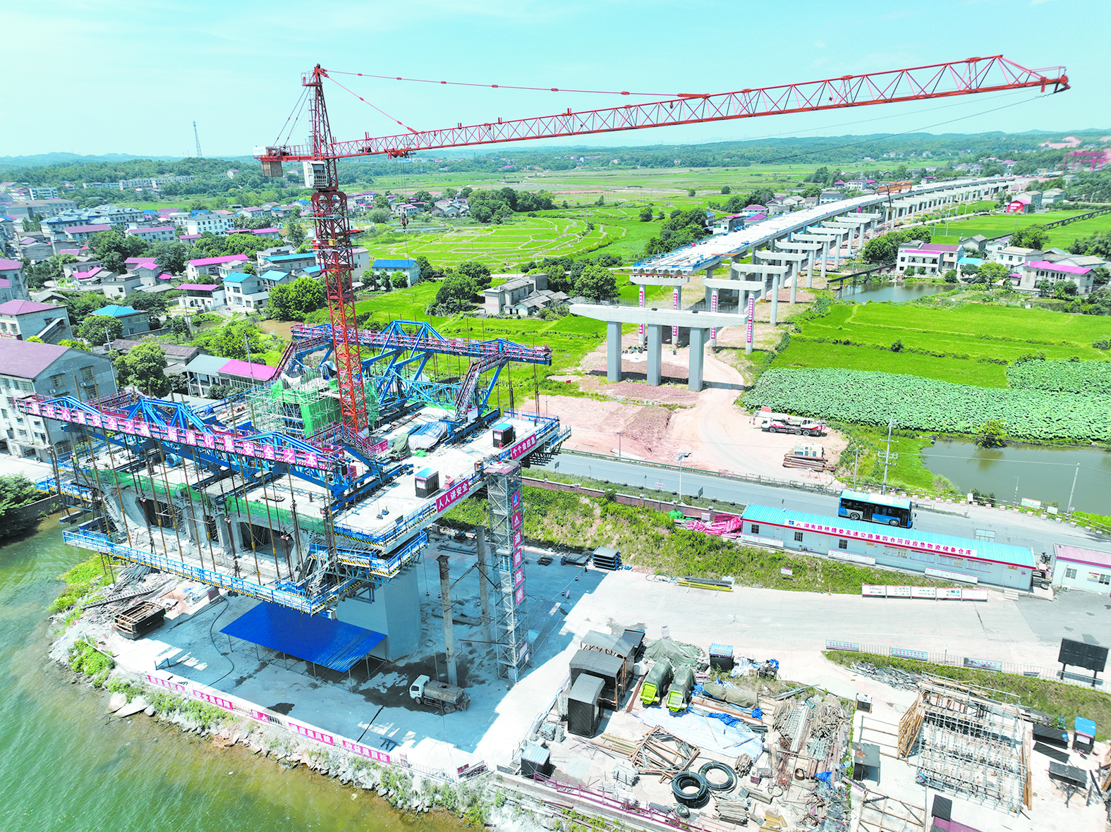 醴娄高速湘江特大桥施工现场,半幅引桥已基本完成桥面架设。 株洲日报全媒体记者/谭浩瀚 摄