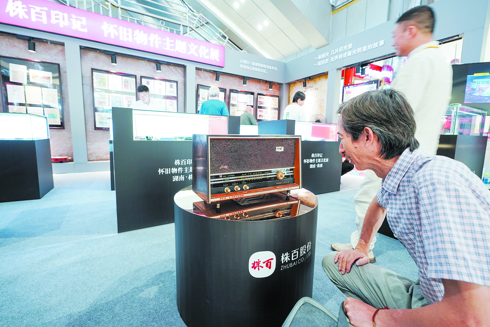 7月15日,市民在株洲百货大楼欣赏一台老收音机。当天,“株百印记·怀旧物件主题文化展”在株百一楼大厅开展,展品包括票据、电器、报刊、音像制品、视频等,反映了株洲建市70余年来城市与生活的变迁。 株洲日报全媒体记者/刘震 摄