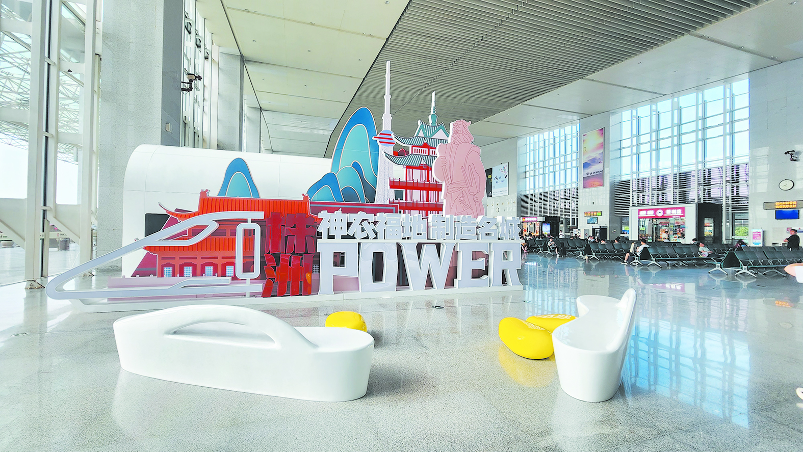 日前,在株洲西站候车大厅增设了一处网红打卡地。这个打卡地以“神农福地 制造名城”为主题,集合了炎帝、炎帝陵、高铁、神农塔等株洲元素,展示了炎帝陵、醴陵瓷谷、云上大院等株洲景点。