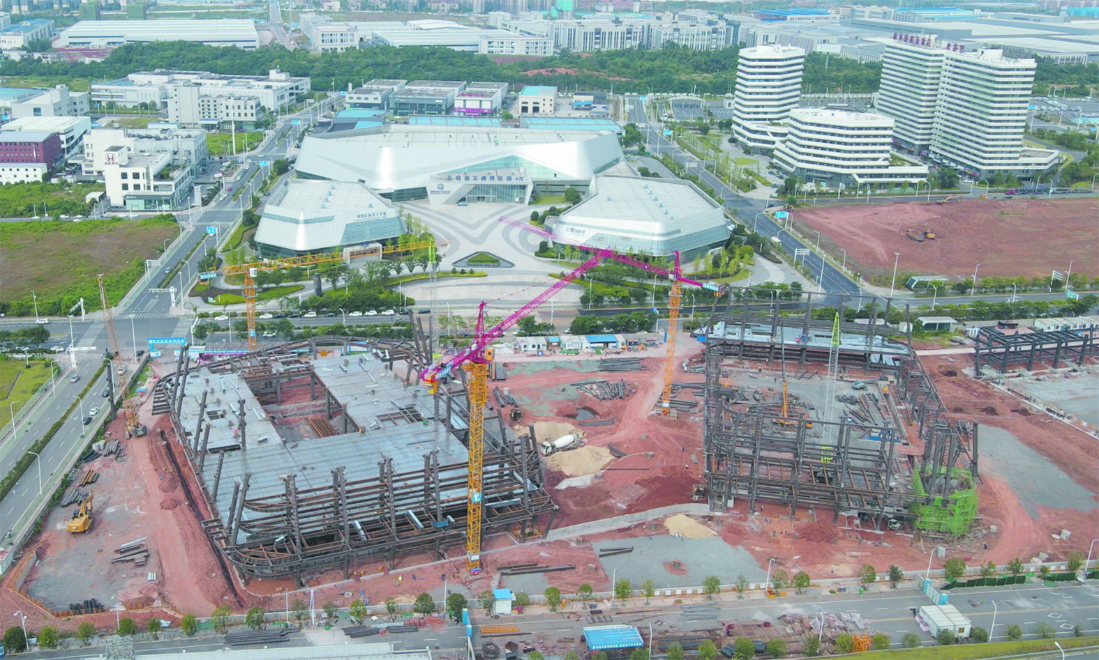 远远看去,展馆雏形已经显现。走进现场,机器的轰鸣声、机构件碰撞的叮当声、工人们的呐喊声,此起彼伏。