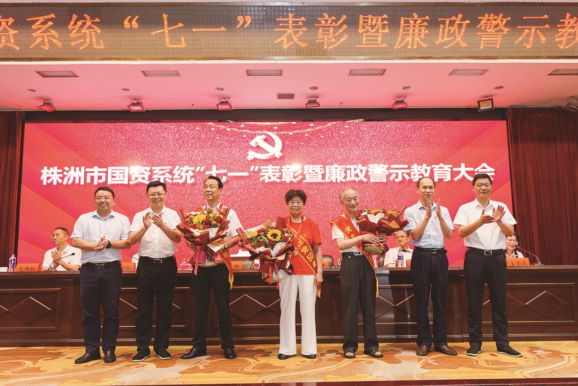 6月27日,株洲市国资系统召开“七一”表彰暨廉政警示教育大会,会上集中表彰了21个“头雁”先进党组织、44名优秀党务工作者、48名优秀共产党员,现场为3名老党员代表颁发“光荣在党50年”纪念章,为“清廉国资·笔墨廉花”书画展一等奖获得者颁奖,组织新党员代表宣誓,全体党员重温入党誓词。