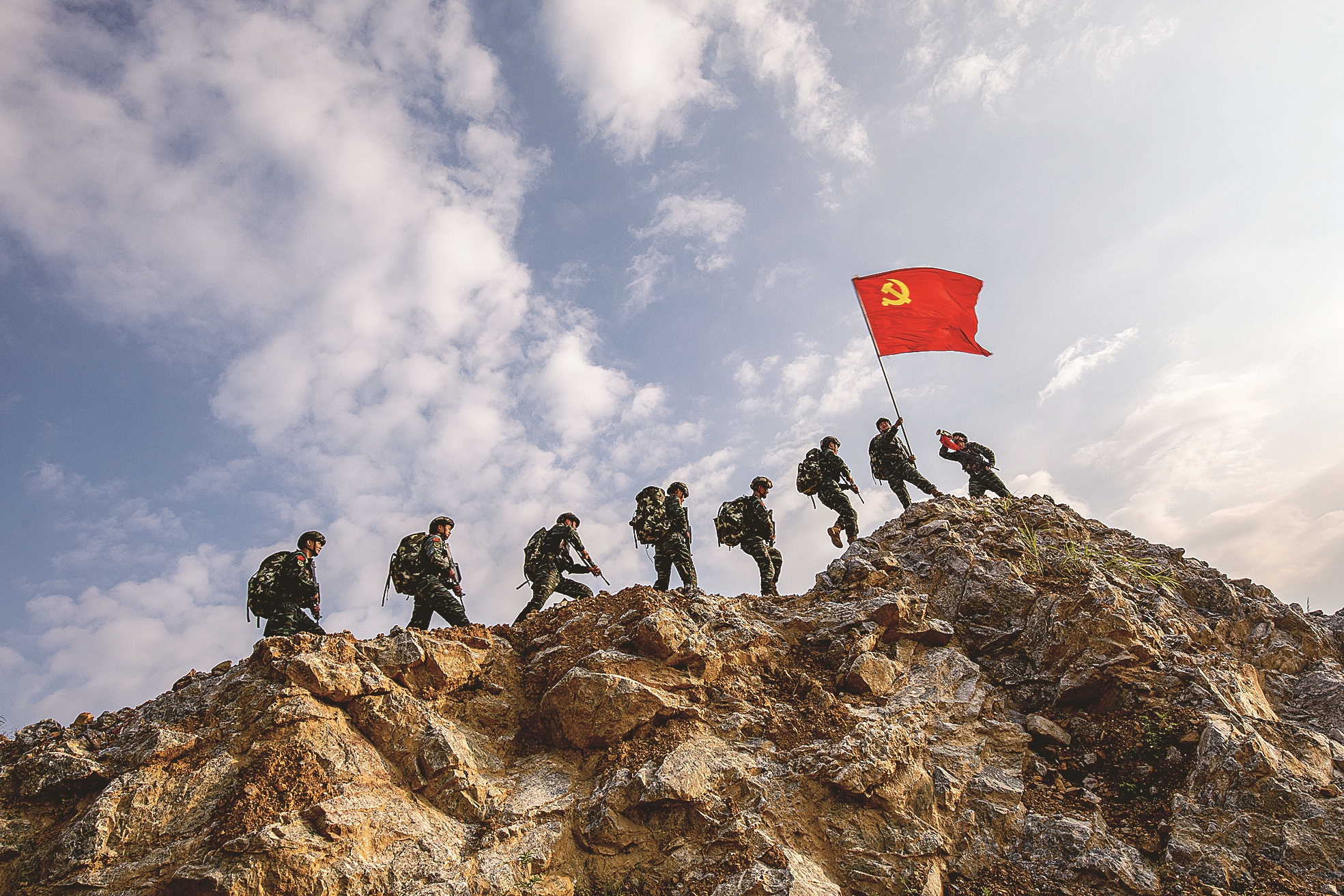连日来,全军部队组织多种形式活动,迎接中国共产党成立102周年。图为武警广西总队贺州支队组织抢占制高点训练,党员先锋队率先登顶(6月30日摄)。 新华社发(张毕海 摄)