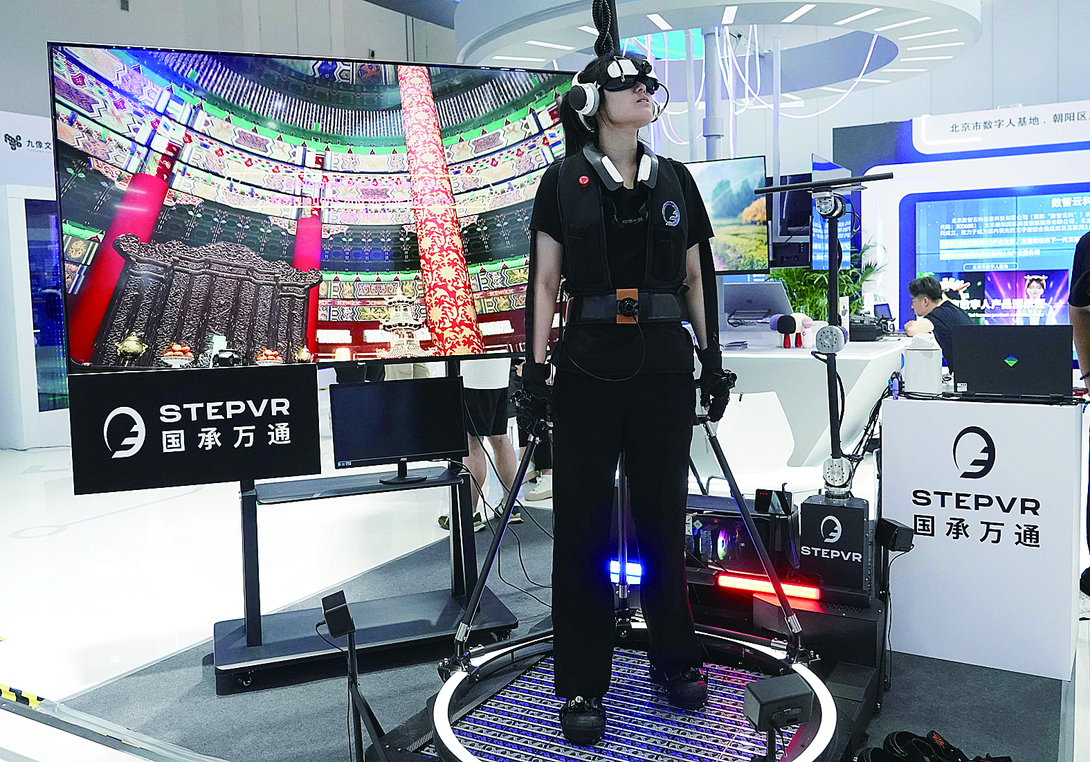 图为7月4日,在2023全球数字经济大会精品主题展现场,工作人员展示VR万向跑步机。