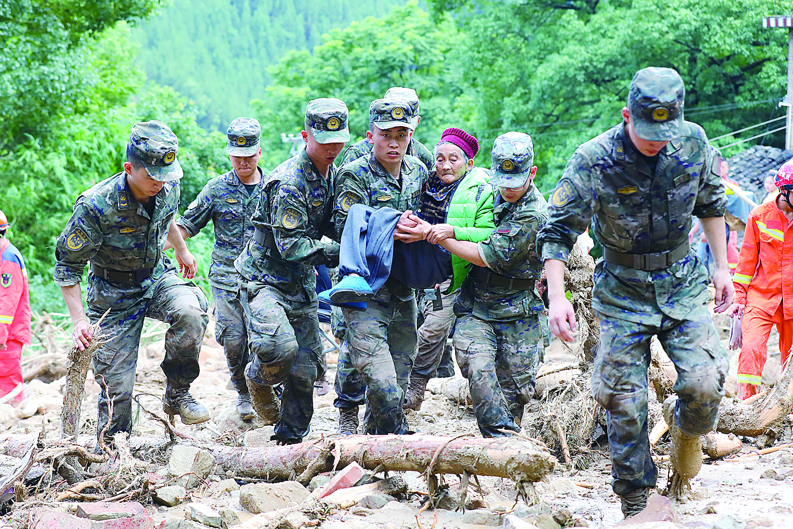 7月4日,在重庆市万州区长滩镇,武警官兵在转移被困群众。新华社发(李东 摄)