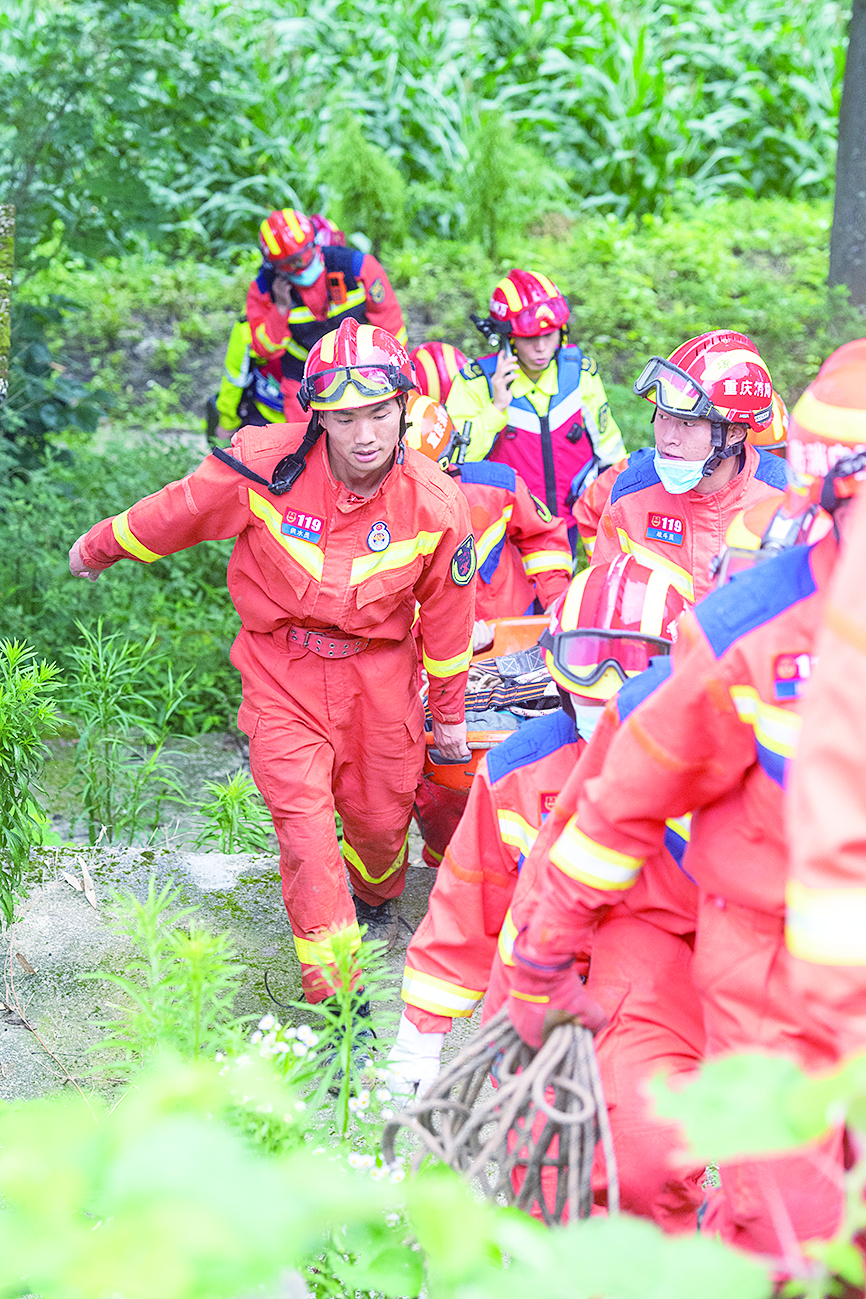7月6日,在重庆市万州区长滩镇林场村,搜救人员在开展搜救。