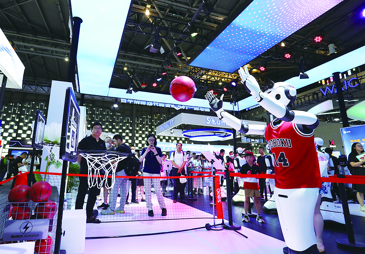 7月6日,一个机器人在2023世界人工智能大会展会现场进行投篮表演。 新华社记者 方喆 摄