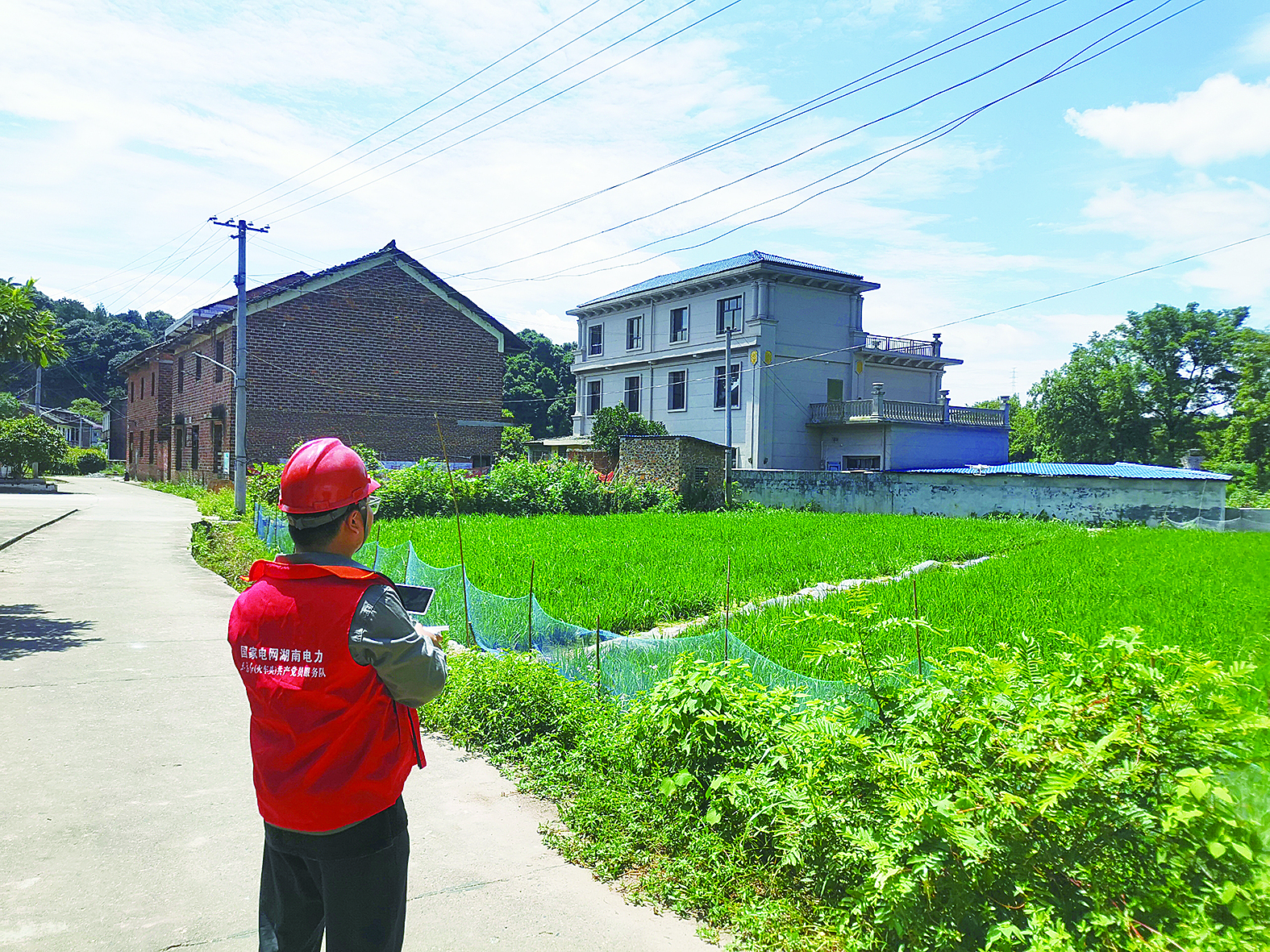 接到陈天华电话中传来的求助信息后,国网攸县供电公司员工陈书弘立马赶到现场。熟悉无人机飞行的他给村民讲解了无人机操作技巧,着重介绍了高压线下放飞的安全注意事项,并为无人机施肥作业设置好精确的飞行区域和轨迹。