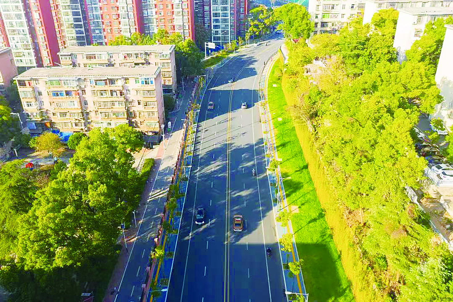 改造后的田心路宽阔平坦,两边草木郁郁葱葱