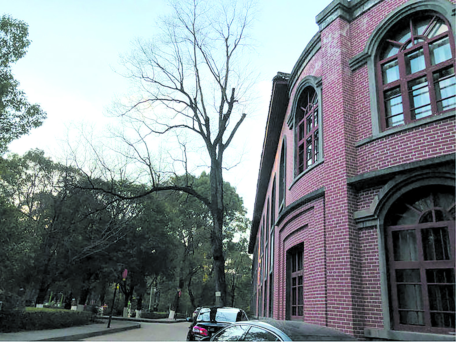 跨进“红门”,天明地净,豁然开朗。一幢幢有着年代感的“红房子”,掩映在绿色的“丛林”中。统一的砖瓦构造,红墙黑瓦,中式风格,木制门窗、扶手楼梯和地板,门窗是清一色的杏黄。往前80米处,是三幢两层木制楼房,中间一幢带双翼,门厅上三角形屋檐下闪耀着五颗红星;左右各有一幢小楼,正中央曾有一座约五米高、4米宽的石碑,四面是标语和题字,周围还有浮雕;只可惜那时识字少,竟然对“草书”的字和图案无甚印象。