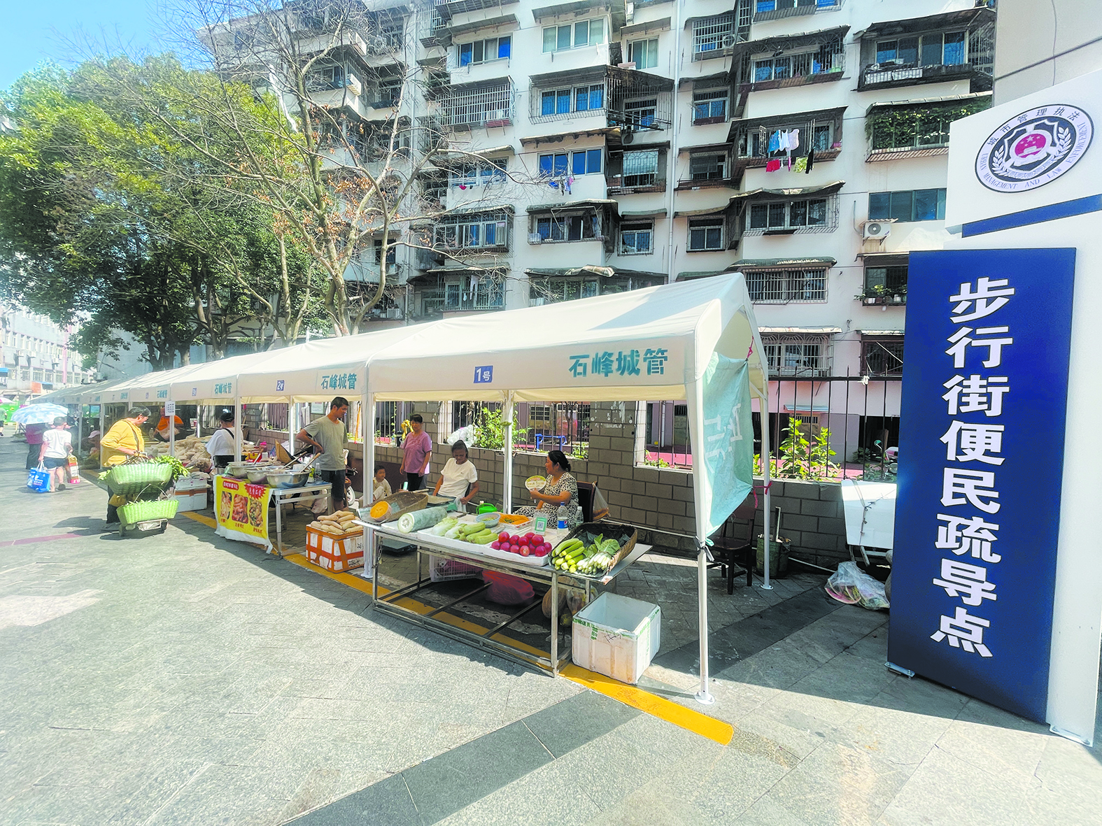 今年以来,我市城管部门积极践行城市精细化治理工作理念,对城区各个“马路菜场”开展走访调查,结合附近居民意见,因地制宜建设便民疏导点。其中,石峰区城管局与响石岭步行街物业管理方协商,在不影响道路正常通行的情况下,在步行街一侧搭建12个遮阳篷,划定便民疏导点,引导原本在周边无序经营的流动摊贩入驻“安家”,并细致划分了蔬菜区、水果区和小商品区等,以疏治堵。