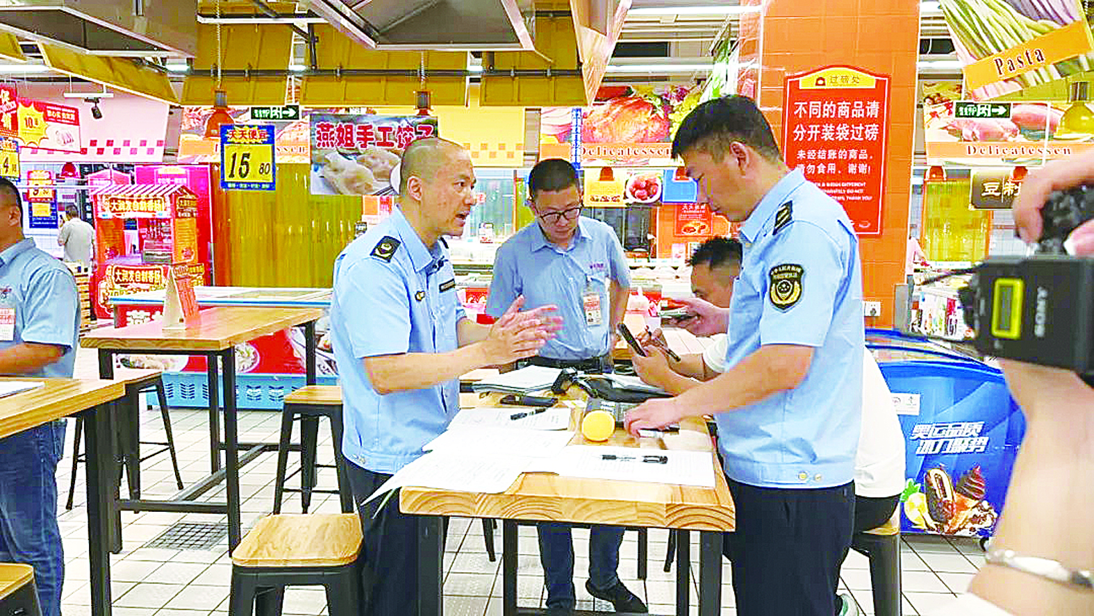 执法人员现场查处荷塘区一超市售卖假冒“炎陵黄桃”。 通讯员 供图