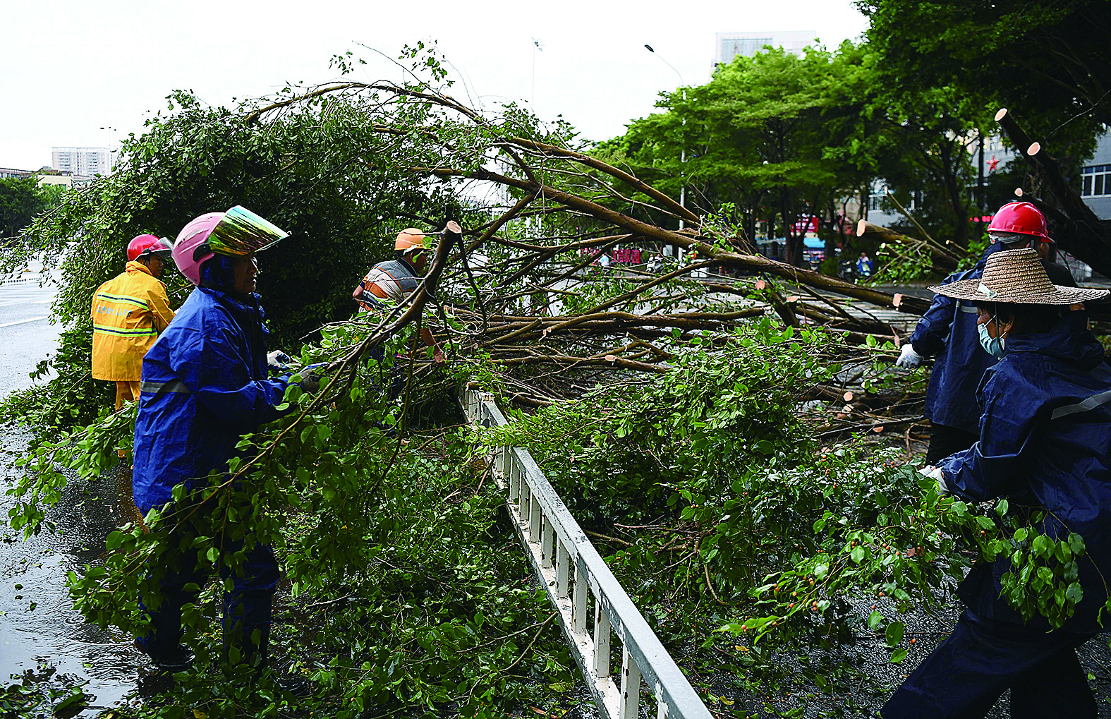 台风“泰利”过境后,广东湛江于7月18日11时将防风应急响应降为Ⅲ级。目前,湛江市区已解除台风预警信号,积极开展倒伏树木清理工作,尽快恢复生产生活秩序。7月18日,在广东湛江市军民路,市政人员在清理倒伏树木。今年第4号台风“泰利”的中心于17日22时20分前后在广东省湛江市南三岛沿海登陆,登陆时中心附近最大风力为13级。新华社记者 邓华 摄