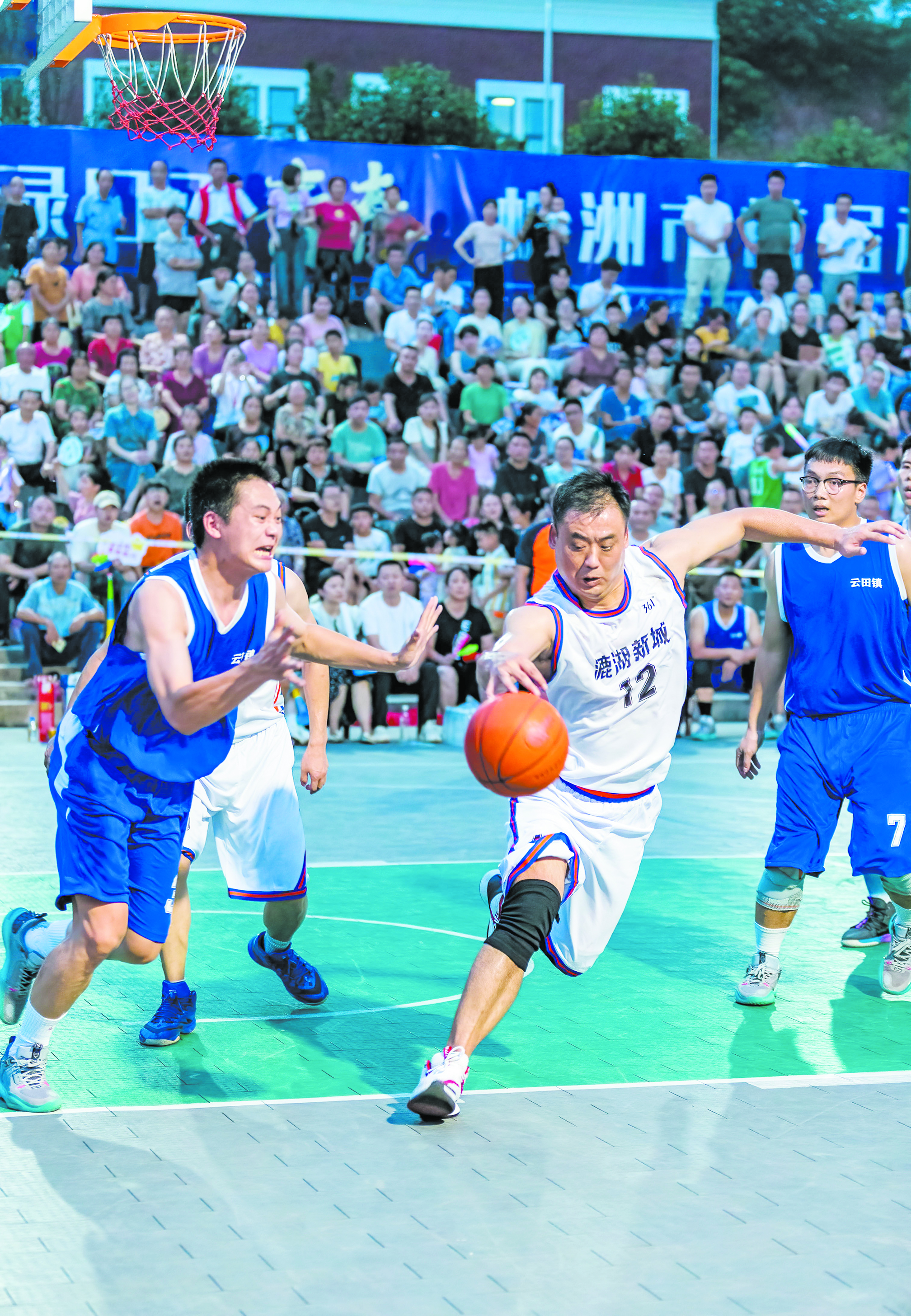 在一阵激昂的鼓点声和呐喊声中,来自渌口区的“青春渌口”队和来自石峰区的“幸福云田”队率先对决。赛场上,运动员们个个精神抖擞,带球、传球、上篮,双方你守我攻、有来有往,虽然都不是专业运动员,却并不影响比赛的观赏性。“加油、加油”“再进一个”……现场观众席坐满了人,不少人挥舞着旗帜、荧光棒,为球队助威;场边,村民自发组成的“敲锣打鼓”气氛组,让现场氛围掀起一个又一个高潮。“这样的活动我们喜欢,大家都参与进来,特别热闹。”王家洲村村民陈翠南说。