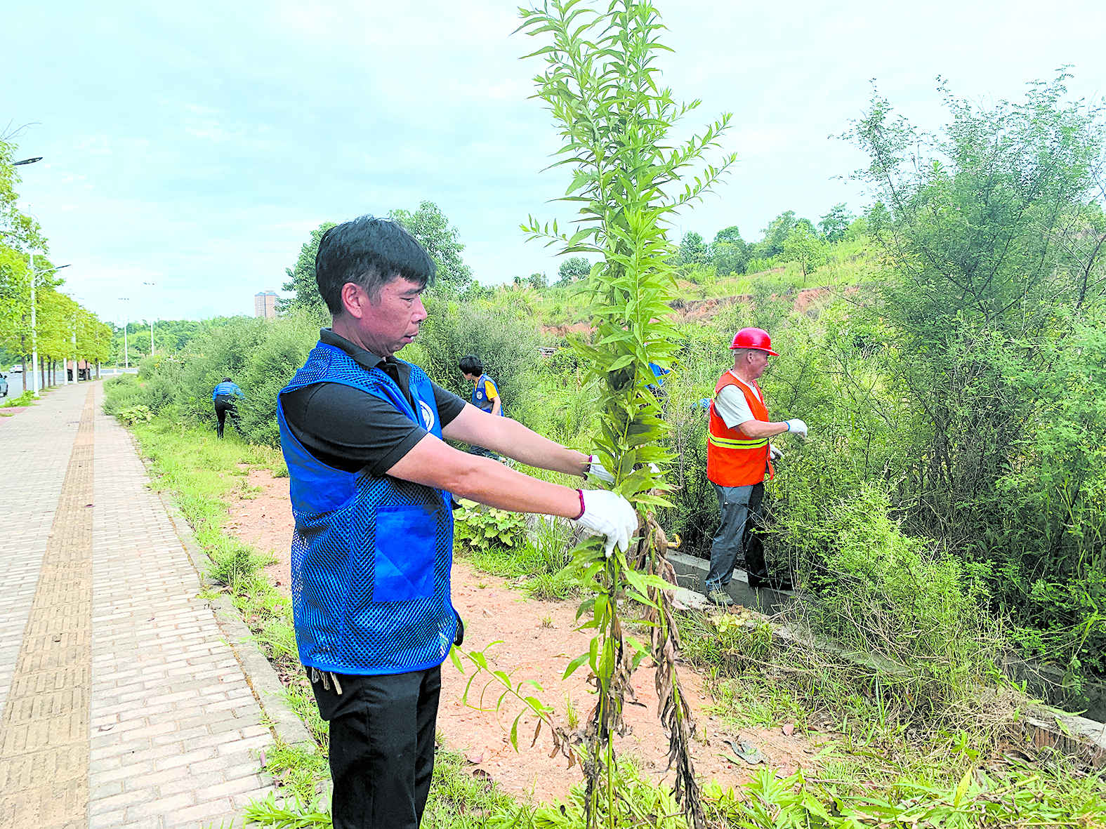 加拿大“一枝黄花”是一种繁殖能力强、扩散速度快的外来入侵植物,其根状茎发达,“独霸”土壤里的养分,抑制其他植物生长,被誉为“生态杀手”。为保护区域生态环境,7月19日上午,渌口区城管局组织30余名志愿者开展清理行动。当天,志愿者们戴着手套,沿着农田和道路两侧等重点区域实施分组行动,对“一枝黄花”实施人工拔除,并进行集中处理。