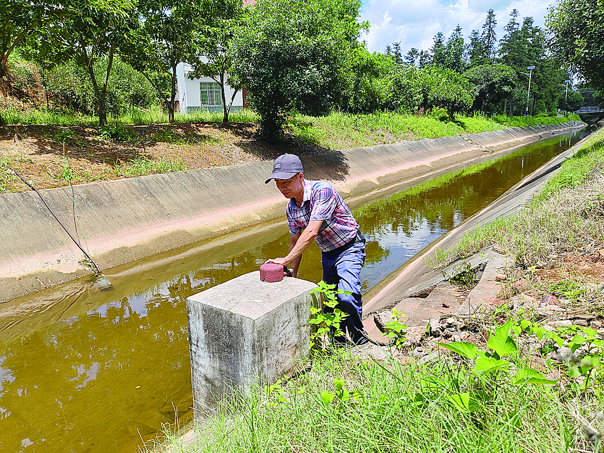 7月25日,在酒埠江灌区西干渠边,攸县江桥街道泥脚巷村村书记吴建湘正与县水利局工作人员商量下一轮的放水时间。泥脚巷村位于西干渠末端,从渠首到达这里要历经32公里,13个小时,全程有143个放水涵闸,往往到达泥脚巷村已所剩无几。今年的情况却不一样,村里让水先进塘,再进田。