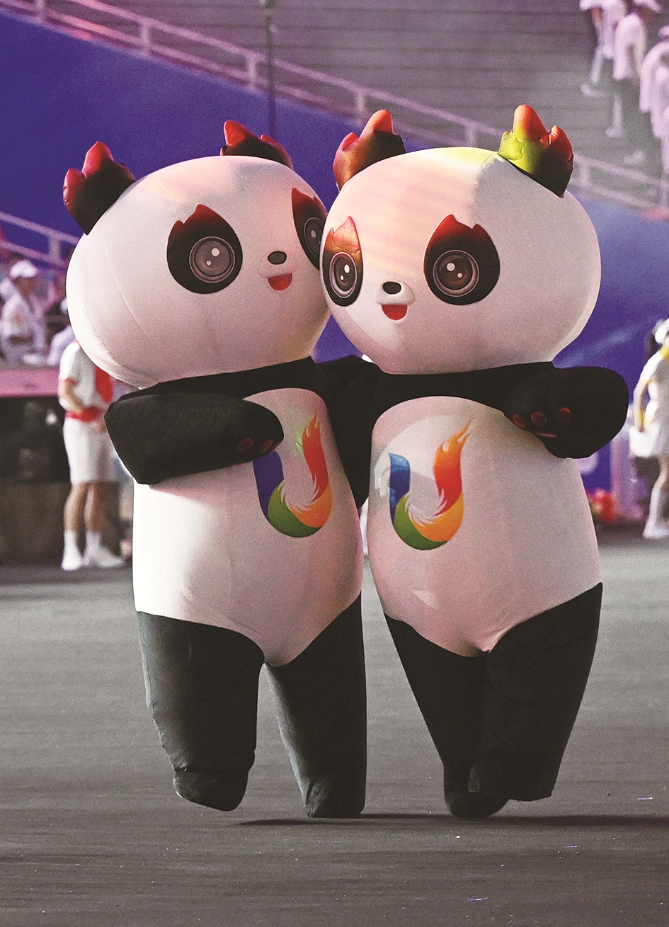 7月28日,成都大运会吉祥物“蓉宝”在开幕式上。 新华社记者 胥冰洁 摄