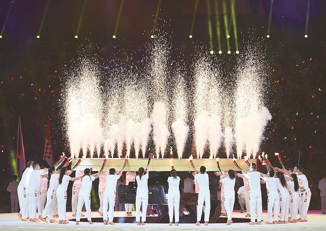 成都大运会开幕式总导演陈维亚:通常大型活动中,火炬都是传到最后一、两个人完成点火,比如2008年奥运会李宁在空中飞跃点火、2022年冬奥会的插入式点火。这次点火的瞬间不叫“最后一棒”,叫“最后三十一棒”。因为是第31届大运会,所以选择了31名火炬手共同点燃本届大运会的火炬塔。