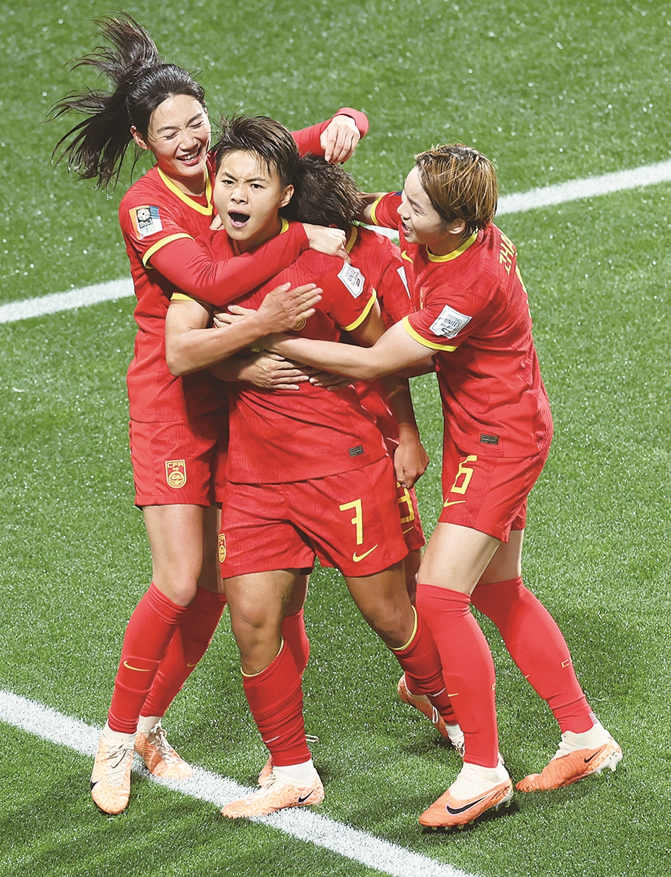 7月28日,中国队球员王霜(左二)在比赛中庆祝进球。 新华社记者 丁汀 摄