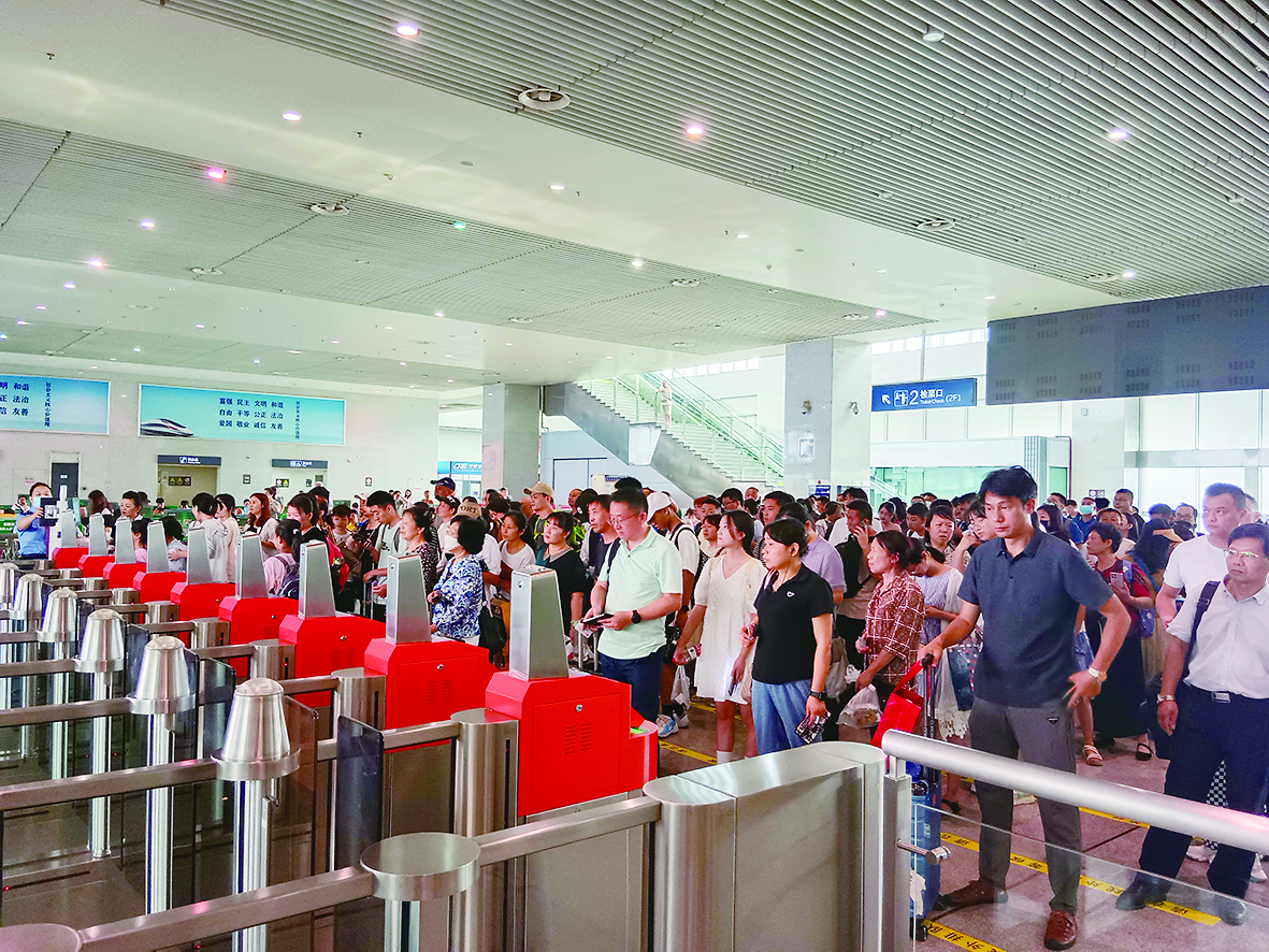 8月2日,武广株洲西站的候车大厅座无虚席,暑期客运迎来客流高峰。截至7月31日,株洲西站共发送旅客271481人次,日均发送旅客8757人次,同比增长6.7%;到达旅客共计280216人次,日均到达9039人次,同比增长11.2%。今年暑运,铁路客流以长途增长为主,旅客出行方式近80%选择高铁动车出行,亲子游持续火爆。图为株洲西站一楼候车大厅,旅客正准备检票进站。