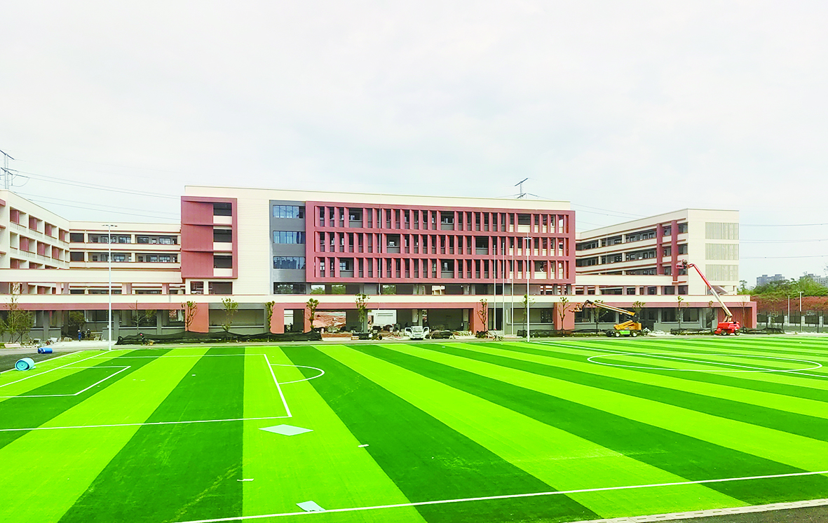 记者在现场看到,所有主建筑已全部建成,仿生草坪已铺设到位,教室里的风扇、护眼灯安装完毕,一部分室内装修和室外附属工程正在收尾。