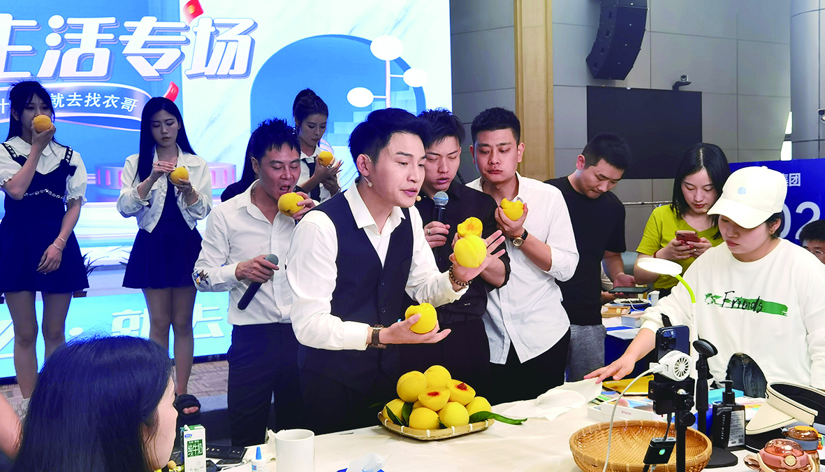 活动首日,衣哥在直播间为炎陵黄桃“带货”。 株洲日报全媒体记者/任远 摄