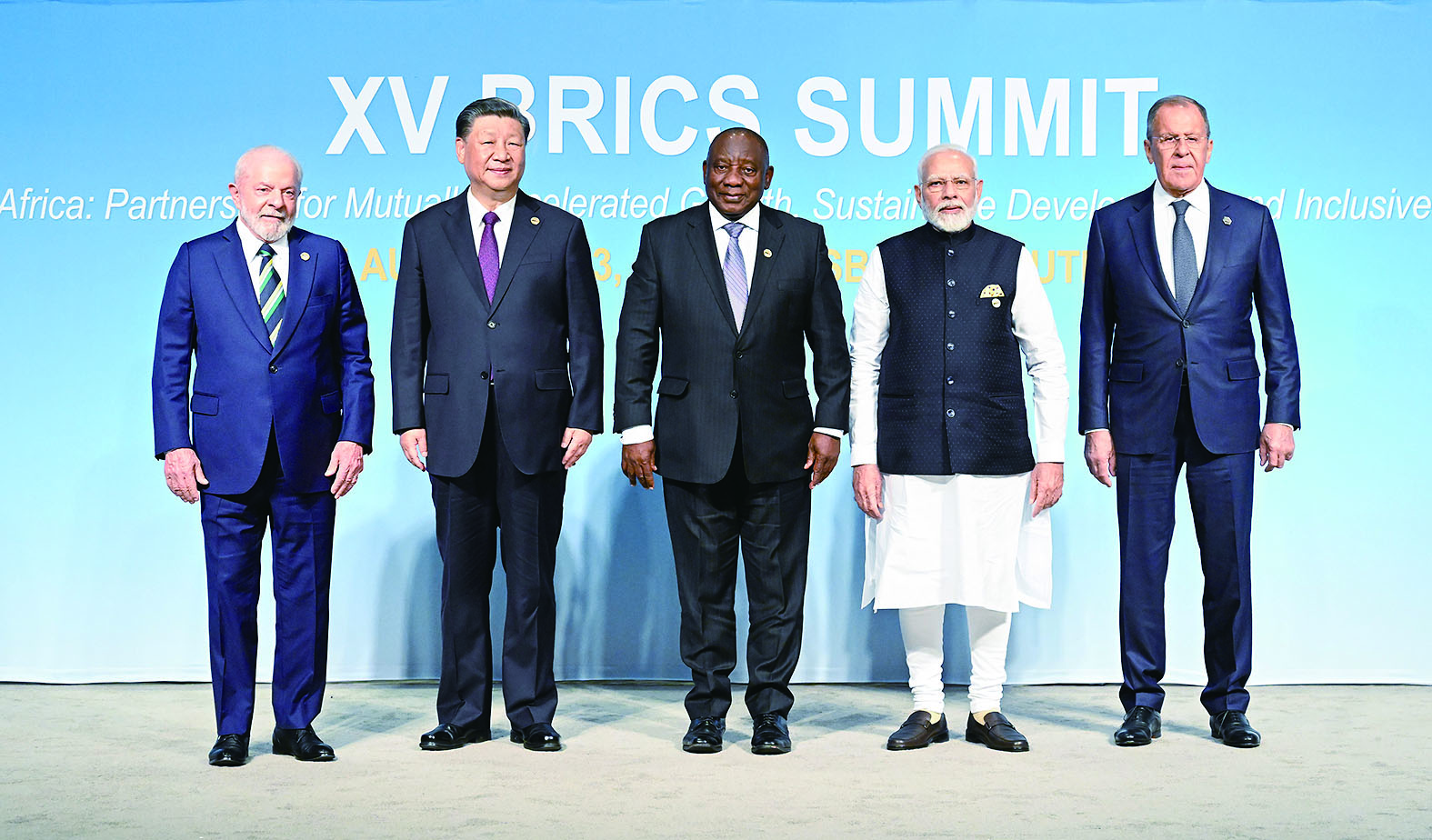 当地时间8月23日上午,金砖国家领导人第十五次会晤在约翰内斯堡杉藤会议中心举行。南非总统拉马福萨主持会晤。中国国家主席习近平、巴西总统卢拉、印度总理莫迪和俄罗斯总统普京(线上)出席。这是会晤期间,五国领导人集体合影。 新华社记者 李学仁 摄