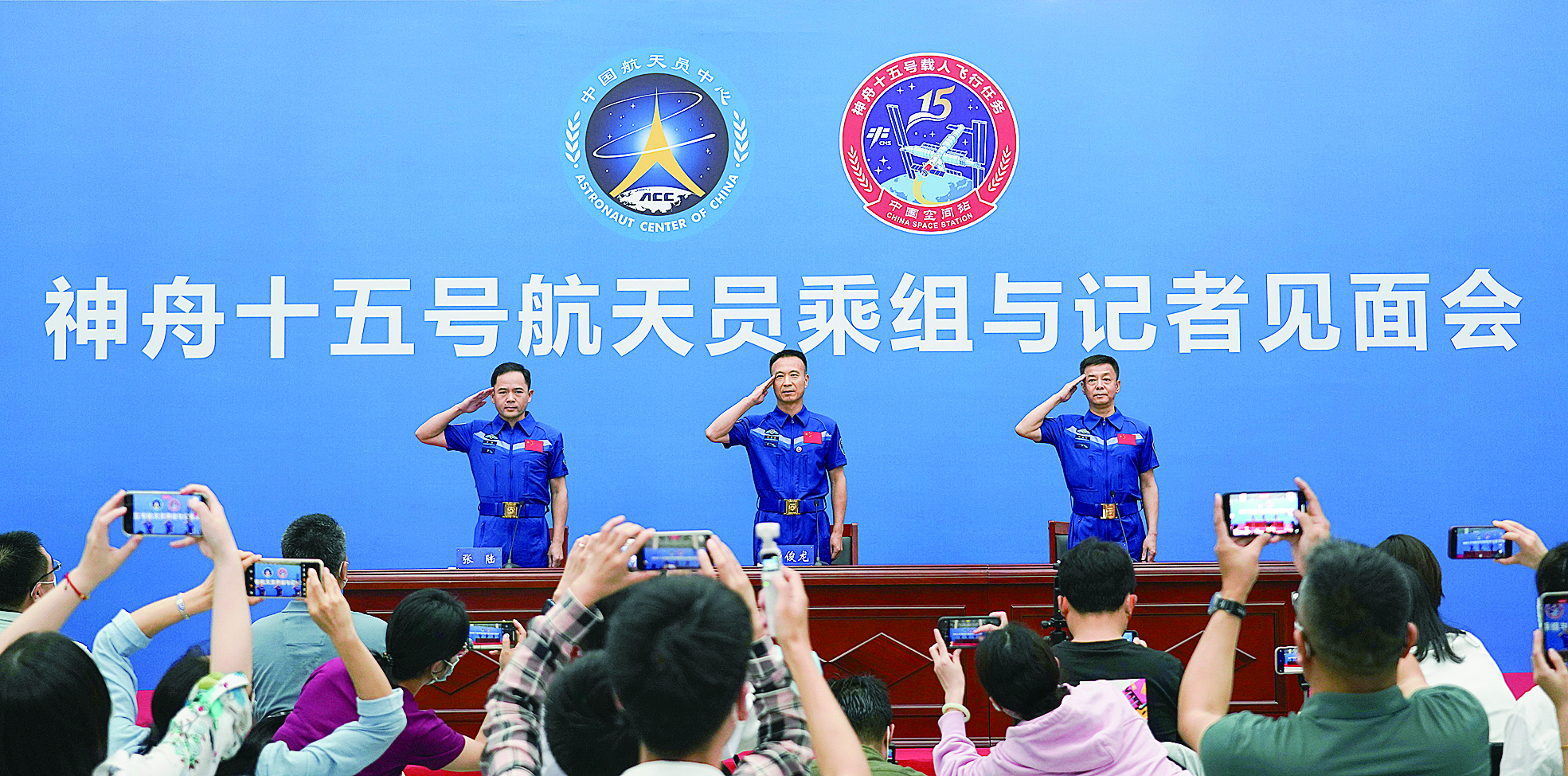 据新华社北京7月31日电 中国航天员科研训练中心31日下午在北京航天城举行神舟十五号航天员乘组与记者见面会。费俊龙、邓清明、张陆3名航天员从太空返回57天后首次正式公开亮相。