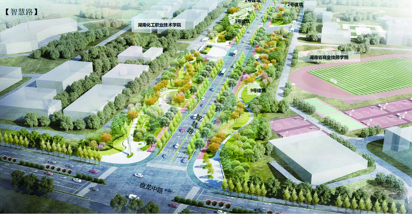 其近期建设计划为智慧路(盘龙中路—厚信路;弘智路—新塘路)段,总长约2.17公里,面积约9.3公顷。远期为智慧路(迎宾大道—盘龙中路)段,长约0.93公里,面积约2.8公顷。并包括智慧广场段,长约0.6公里,面积约11.39公顷。