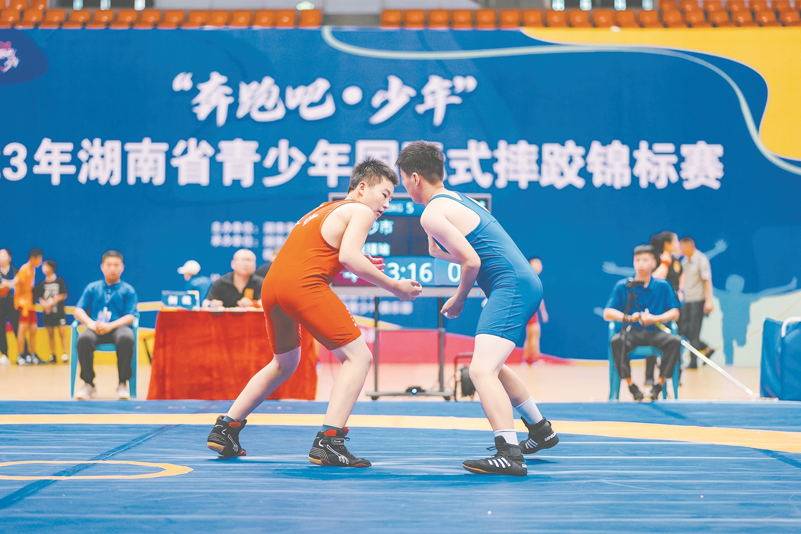8月3日,由省体育局、教育厅联合主办的“奔跑吧·少年”2023年湖南省青少年国际式摔跤锦标赛,在株洲市全民健身服务中心体育馆拉开帷幕,来自全省各地的18支代表队共700余名运动员及教练员汇聚一堂,根据年龄分别开展U13(8个重量级别)、U15(8个重量级别)、U18(4个重量级别)三个组别的角逐。