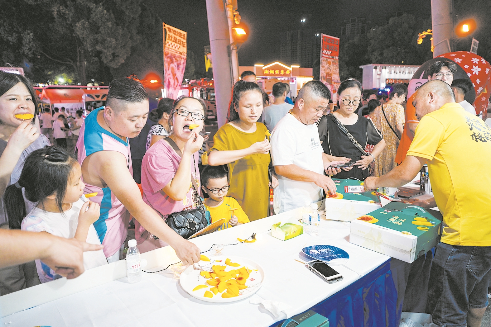 炎陵中村乡黄桃大会游客与黄桃合影。