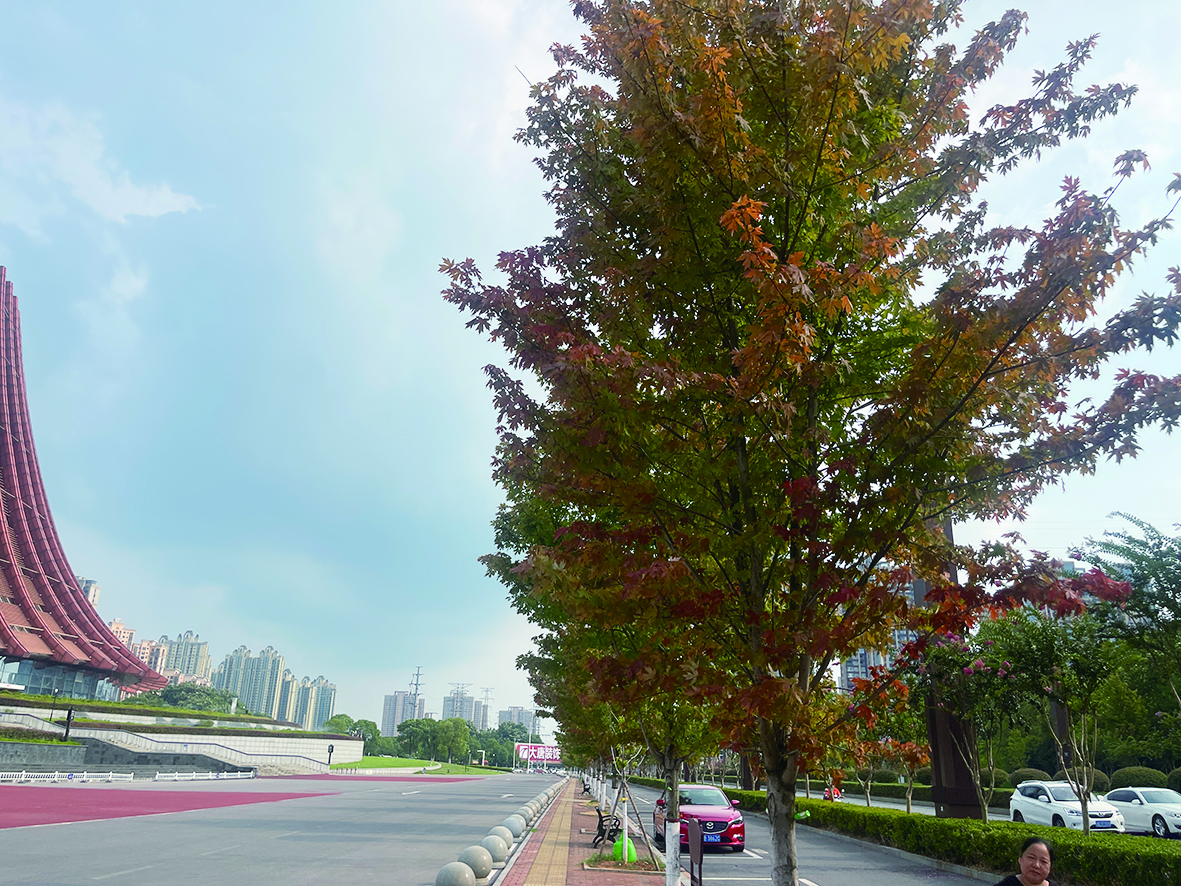 持续高温天气,神农大道沿线不少枫树的叶片提前转色。