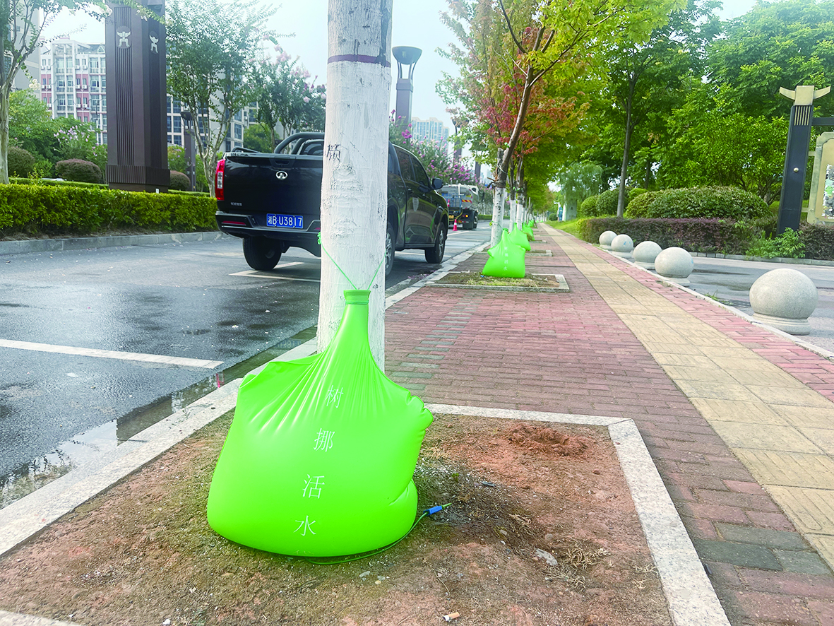 目前,天元区就给神农大道、株洲西站沿线的1200株行道树,配置了这一“神器”。每个滴灌水袋的容量是40升,装满一次约可使用三天,确保树木用水“不断档”。