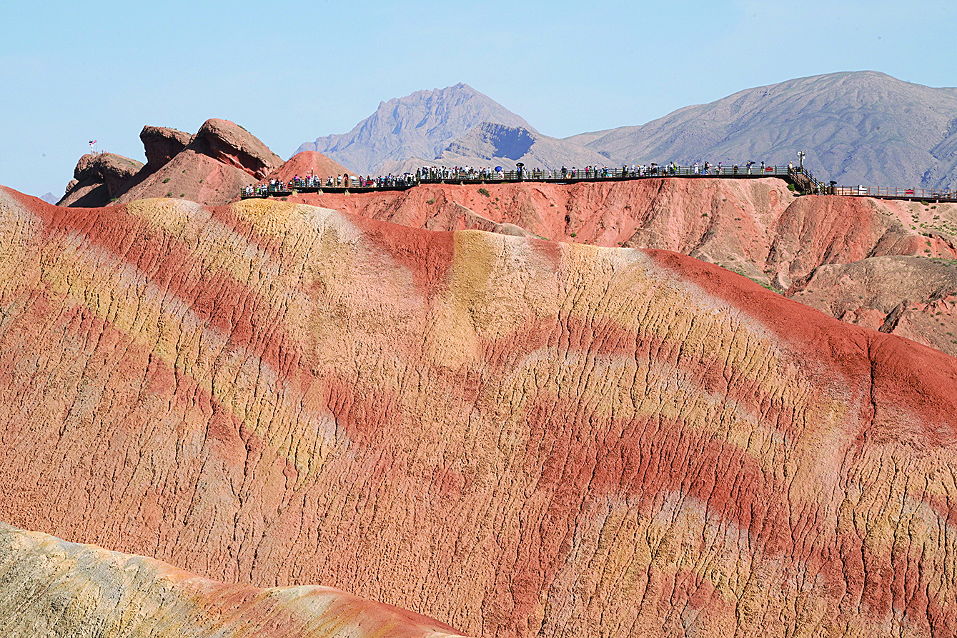 位于甘肃省张掖市境内的张掖七彩丹霞景区属张掖国家地质公园,是罕见的丹霞地貌与彩色丘陵景观复合区。进入8月以来,七彩丹霞景区日均游客数量突破3.5万人次。图为8月7日游客在张掖七彩丹霞景区参观游览。 新华社记者 马宁 摄