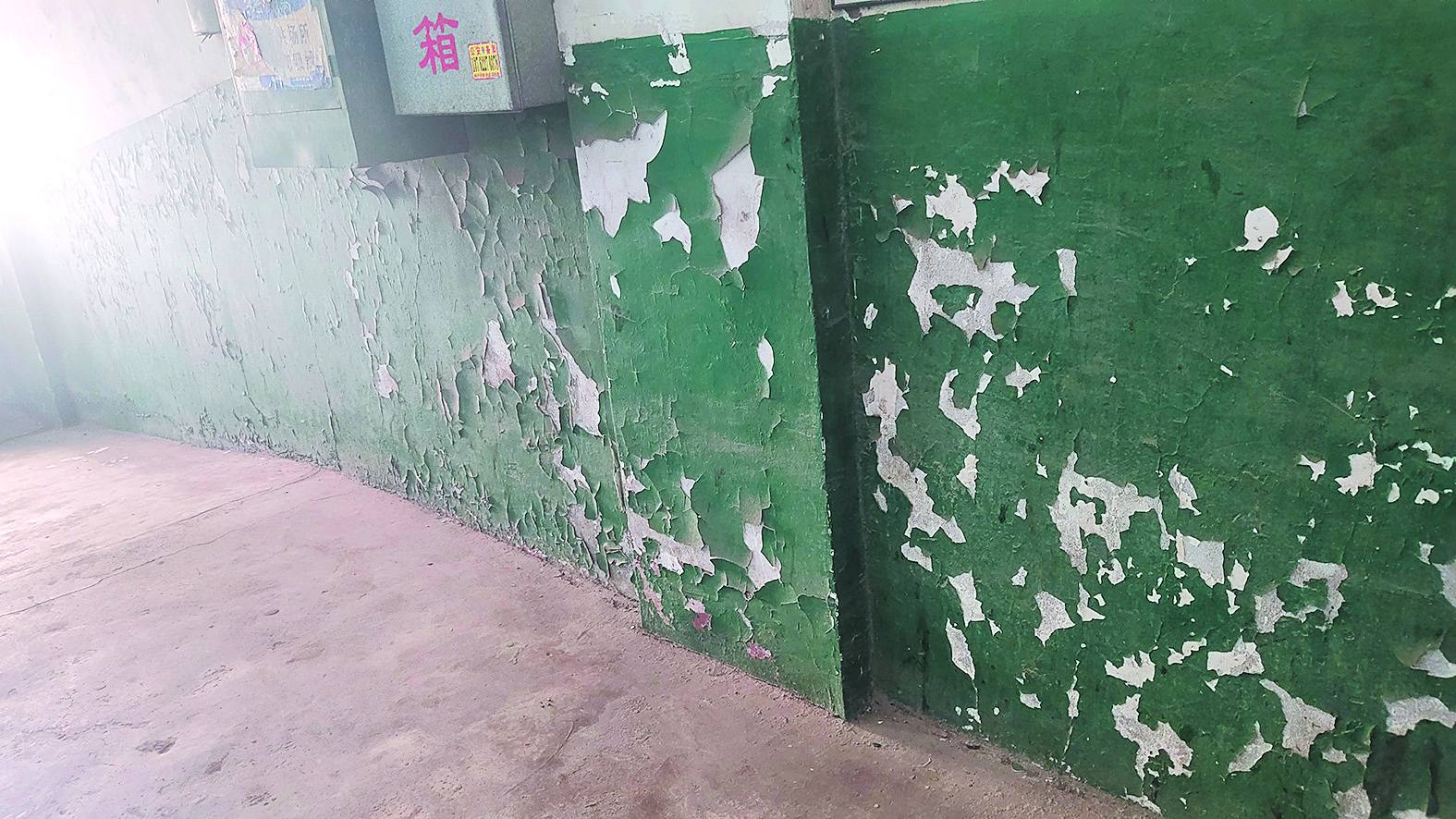 ▶绿色墙体油漆大片脱落。 记者/徐滔 摄