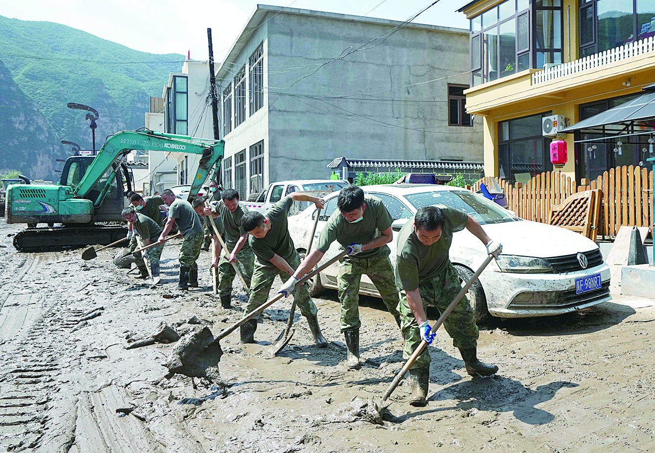 8月8日,志愿者在河北涞水县三坡镇刘家河村道路上清理淤泥。 新华社记者 杨世尧 摄