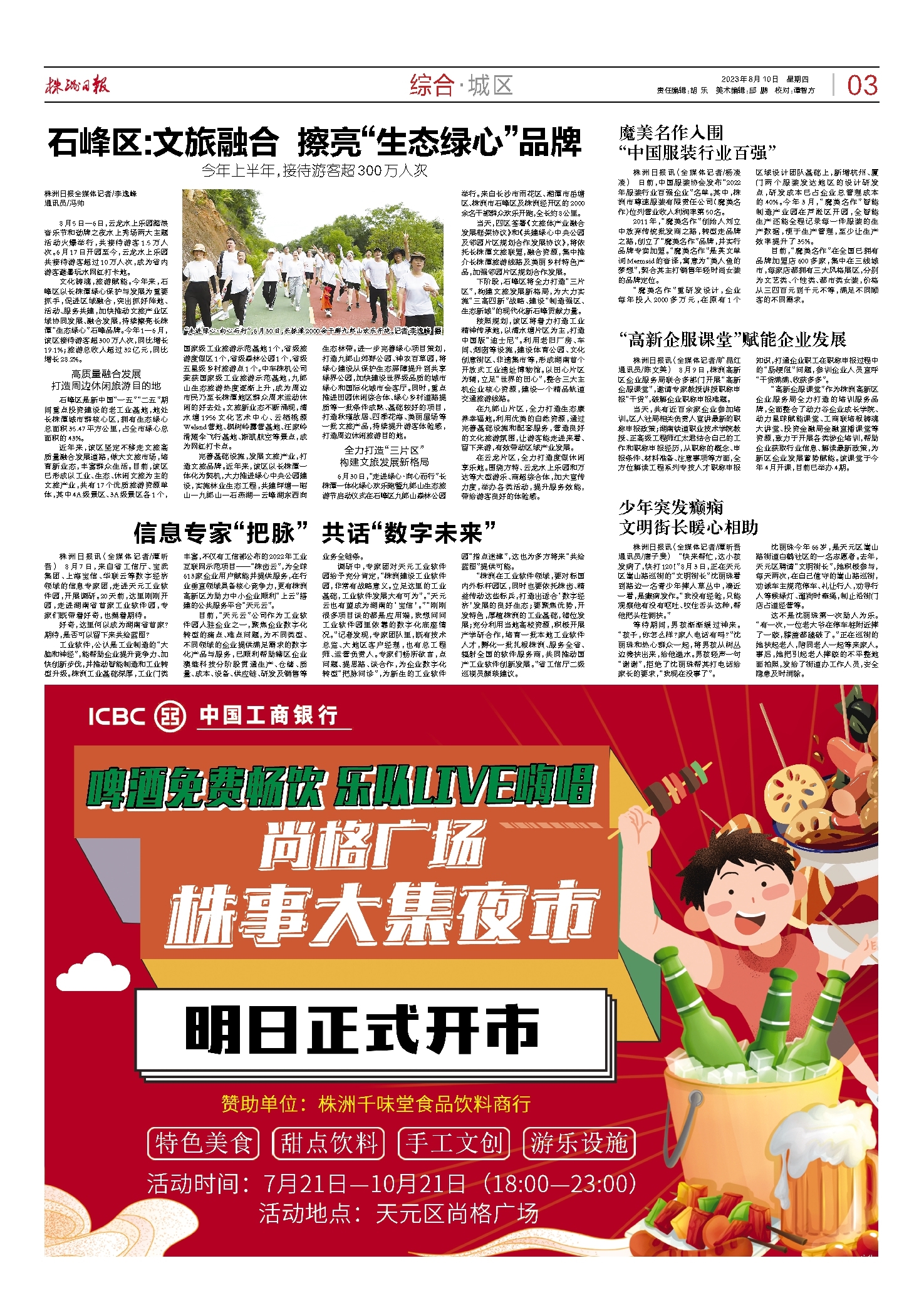 文化铸魂,旅游赋能。今年来,石峰区以长株潭绿心保护与发展为重要抓手,促进区域融合,突出抓好阵地、活动、服务共建,加快推动文旅产业区域协同发展、融合发展,持续擦亮长株潭“生态绿心”石峰品牌。今年1—6月,该区接待游客超300万人次,同比增长19.1%;旅游总收入超过32亿元,同比增长28.2%。