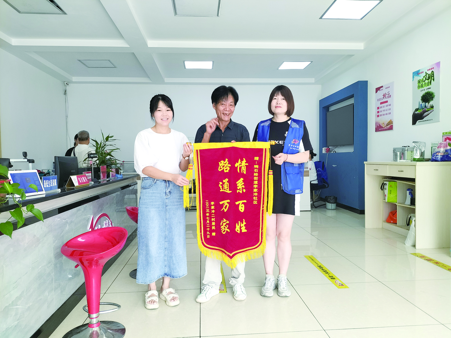 8月14日上午,石峰区响石岭街道李家冲社区散户居民将一面“情系百姓 路通万家”的锦旗送到社区,感谢政府和社区利用惠民资金,为民修路办实事,解决居民长期出行难问题。