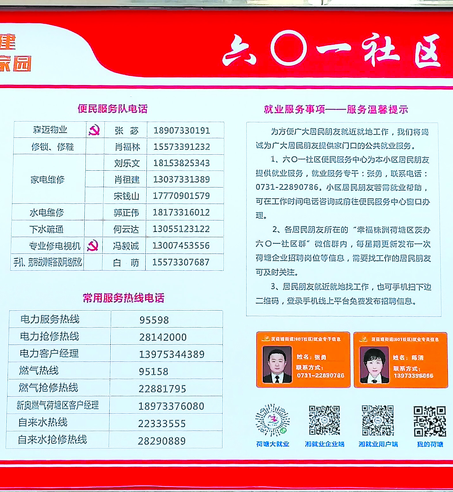 同时,社区在每个小区单元门口提供统一、规范的粘贴栏,引导商家集中规范张贴广告;社区还将维修服务队的相关联系电话发布在居民微信群。