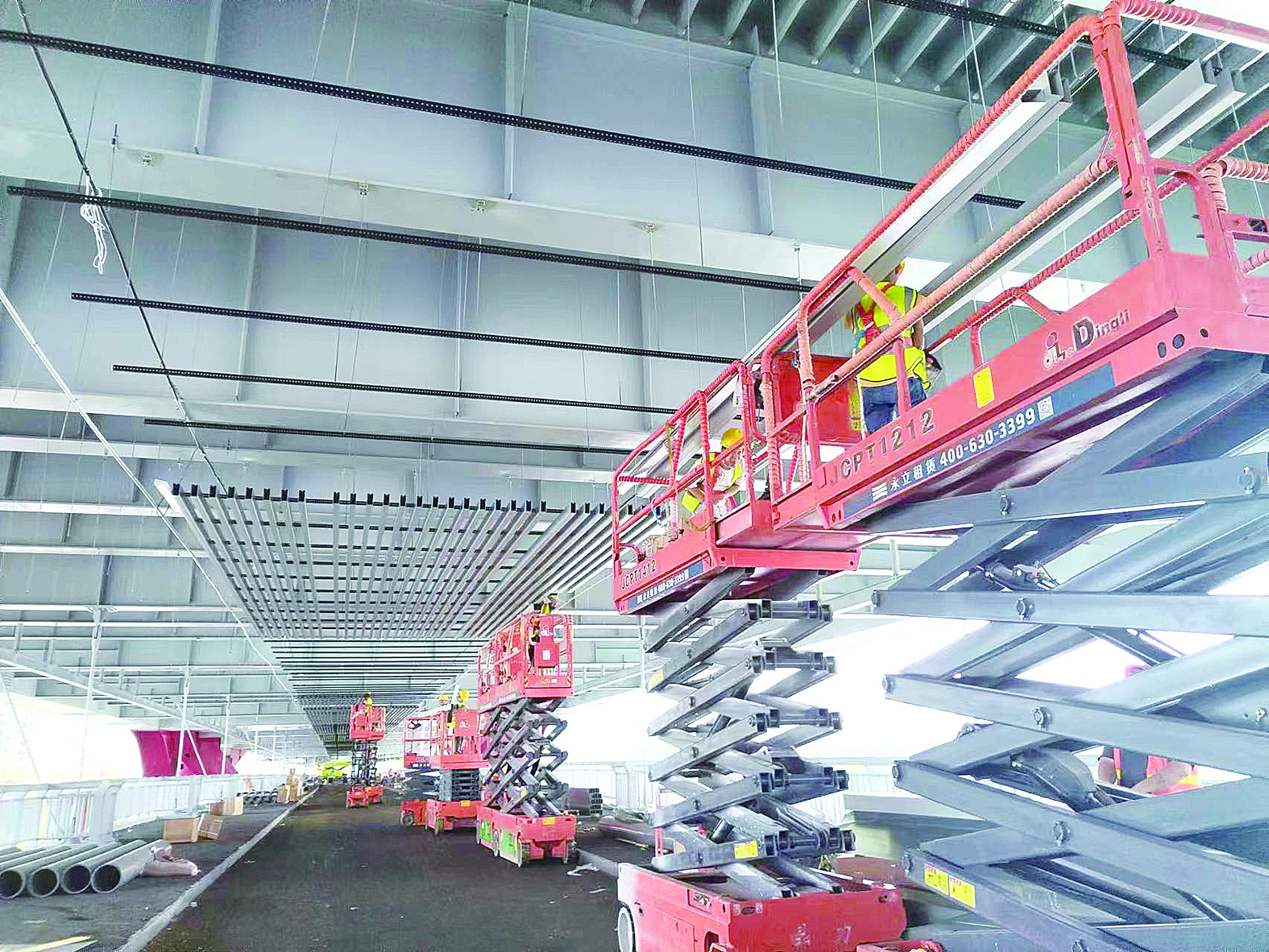 “一楼”路面停放着大大小小登高作业车共有30余辆,大车负责安装排水管线,小车则负责安装天花板吊顶和照明设施。