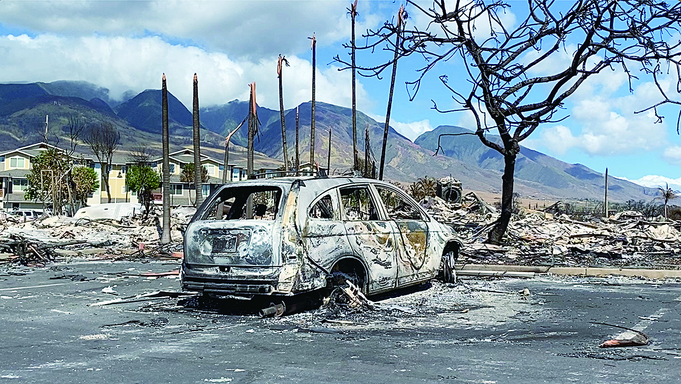 8月14日在美国夏威夷州毛伊岛拉海纳拍摄的野火烧毁的建筑和汽车残骸。 新华社发(杨平俊 摄)