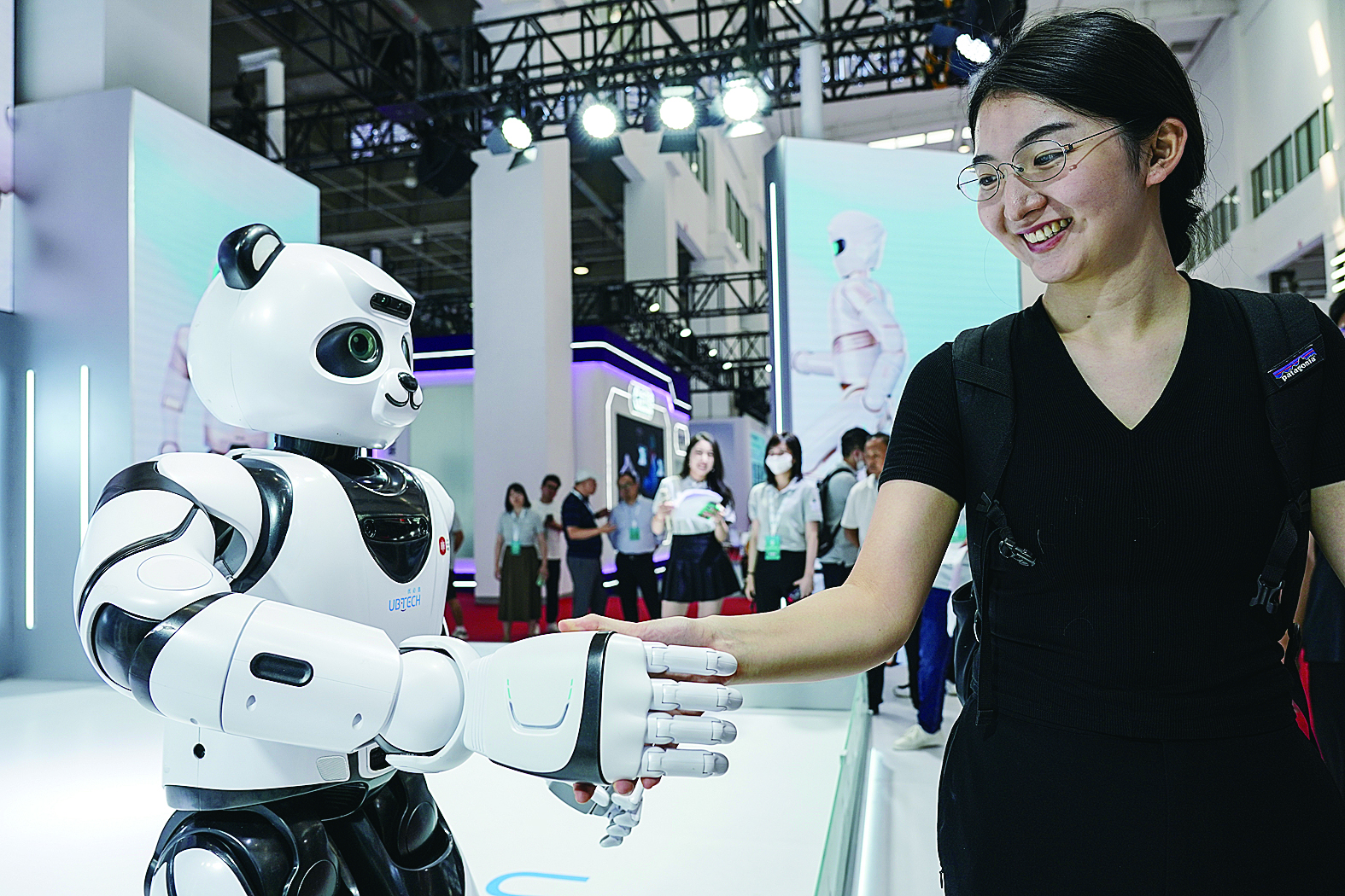 8月16日,一位女士与智能机器人握手。当日,2023世界机器人大会在北京开幕,本次大会的主题为“开放创新 聚享未来”,包含论坛、博览会、机器人大赛等活动。