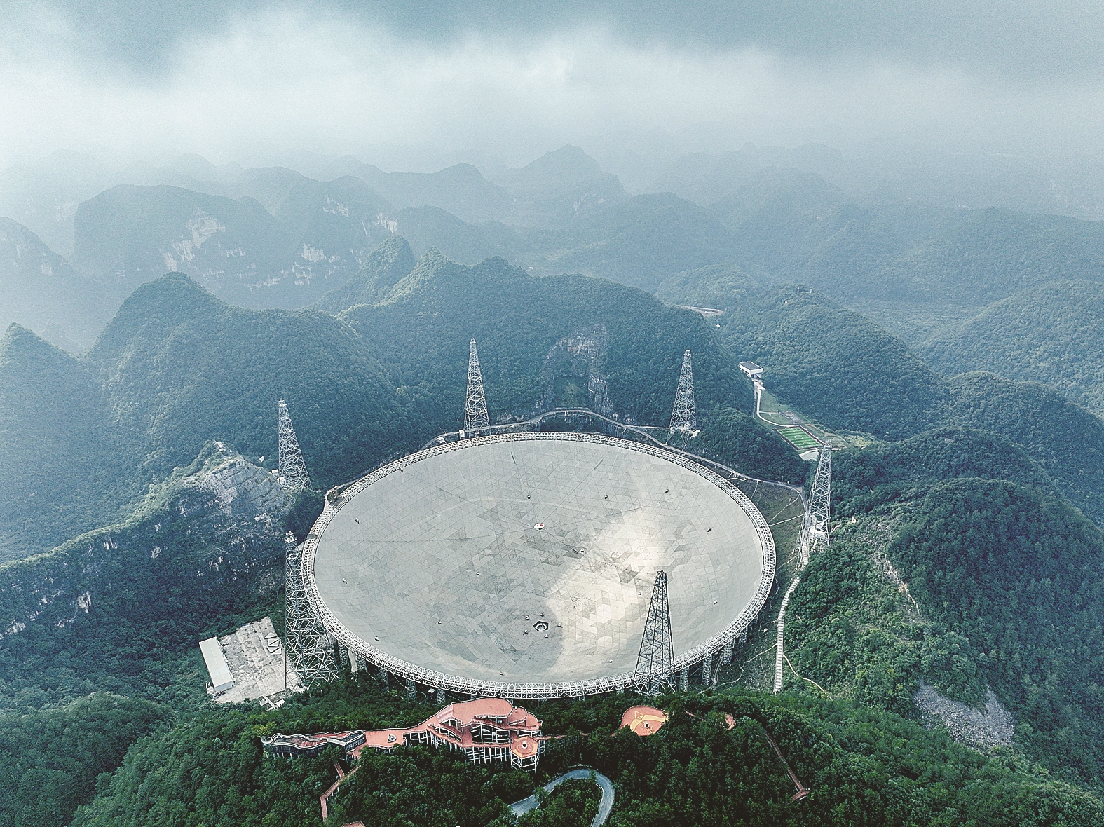 日前,我国科研团队利用“中国天眼”FAST,从一颗脉冲星原本被认为“熄灭”的状态中探测到一批极其微弱的窄脉冲,这是“中国天眼”探测到的脉冲星辐射新形态,对揭示脉冲星磁层的极端物理环境等具有重要科学意义。该研究由中国科学院国家天文台研究员韩金林领导的科研团队完成,相关成果8月18日在国际学术期刊《自然·天文学》发表。 这是近日拍摄的“中国天眼”全景(无人机照片)。新华社发