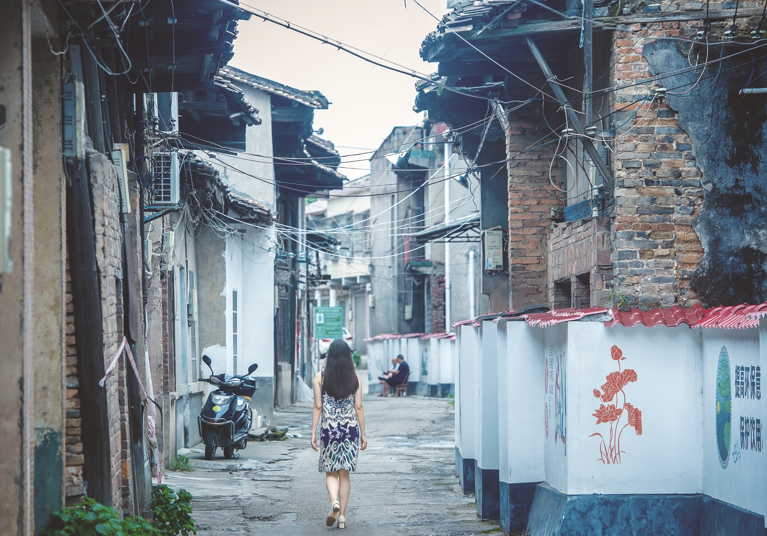 古镇还有个特色,临街有一人多高的围墙一字排开,原是为了防止洪水而建,现在看来,旧时与现时,同框相映,颇有意趣。