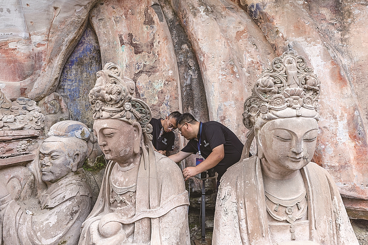 图中为大足石刻宝顶山景区,工作人员对石刻造像病害进行处理。