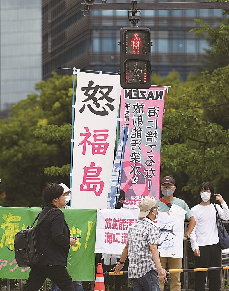 日本政府22日上午举行内阁成员会议,决定于8月24日启动福岛核污染水排海。当天,许多日本民众在东京的首相官邸前紧急集会,抗议政府无视民意启动核污染水排海。